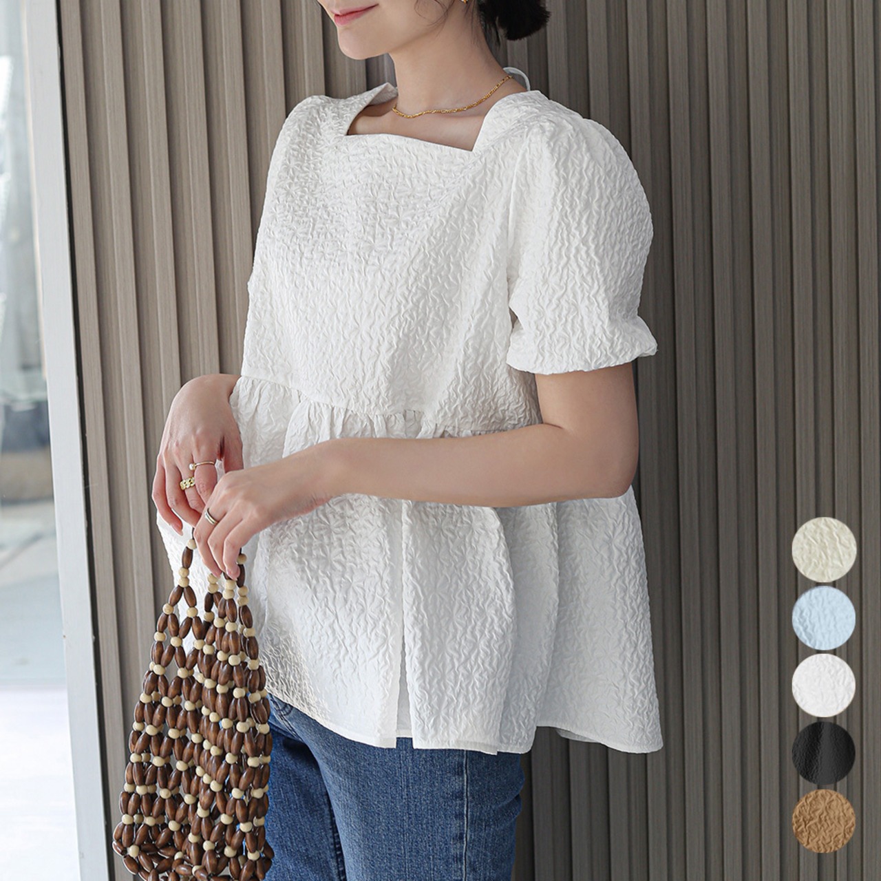 ぽこぽことした凹凸シワ加工を施した生地は独特の風合いがあり、程よいカジュアル感を演出してくれるペプラムブラウスです