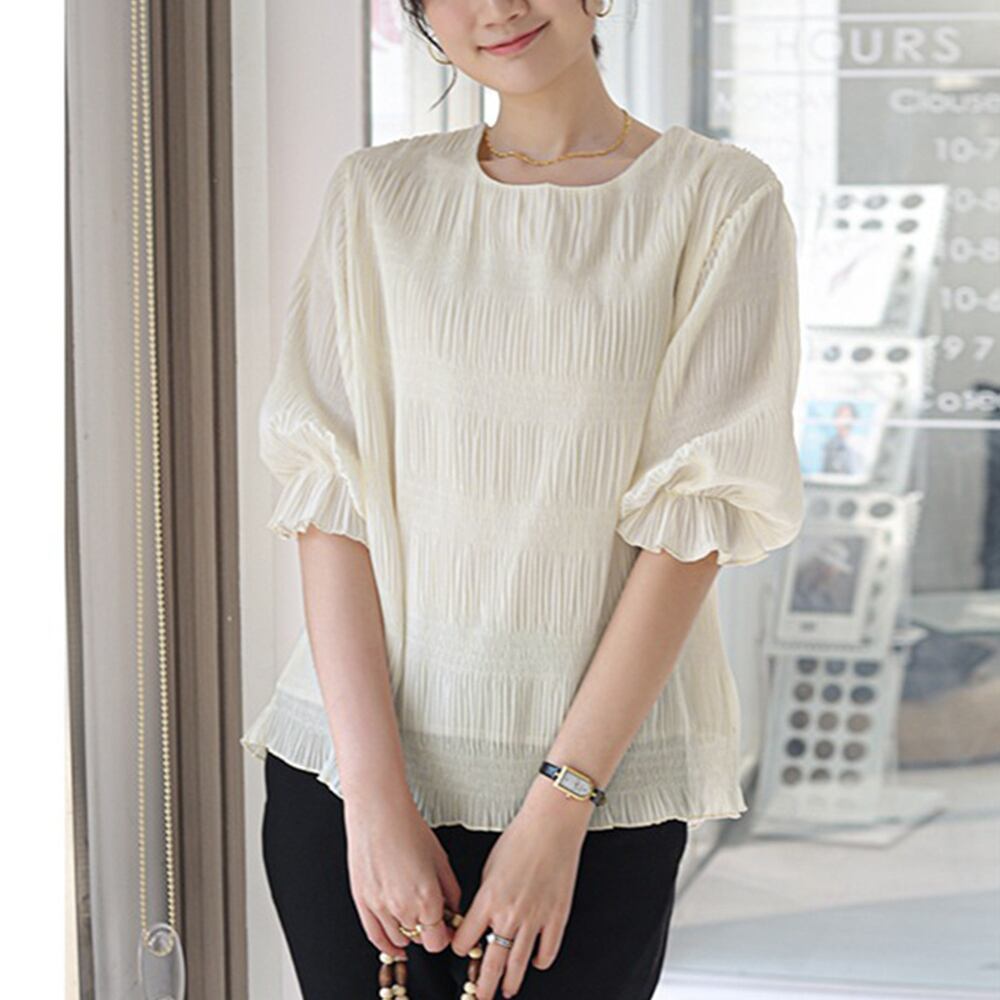 軽く涼しげな生地を使用し、着心地が快適な5分袖ブラウスです